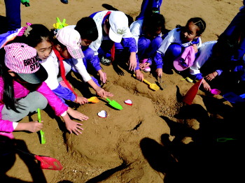 10日上午,青岛基隆路小学的学生们在石老人海水浴场进行沙雕比赛。不一会儿,沙滩上出现了一座座充满无限创意的沙雕作品:活灵活现的大海豚、大螃蟹、大海龟、有形象逼真的小城堡还有生动鲜活的海底世界。