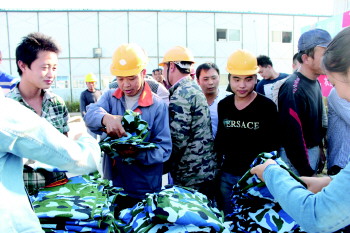 军训服可谓大学生入校的第一件“家当”。不过军训一结束,这套近百元的服装就压箱底了。为避免资源的浪费,充分发挥“迷彩绿”的价值,11日下午,青岛理工大学等五大高校联合中建三局安装分公司山东经理部面向大一新生征集一千五百余套迷彩服。这些衣物清洗、折叠、整理后,托运至项目部后免费发放给农民工。拿到耐脏又结实的迷彩服,农民工朋友很开心。