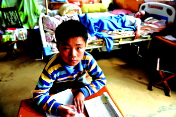 王荣今年上五年级,自从父亲住进医院后,王荣为了照顾母亲就辍学在家。刚开始王荣还趁母亲休息时间去学校听一个小时左右的课,然后很快回家给母亲翻身。可随着琐事的增多,王荣再也没时间回到学校,闲着的时候他会拿出翻过好多遍的课本来看一下。