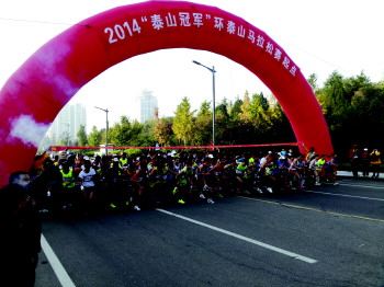 11日早上7点半,2014“泰山冠军”马拉松赛在望岳西路北首鸣枪起跑,比赛分为10公里迷你马拉松赛、42公里超级马拉松赛,起点均设在望岳西路北首,共有来自全国各地的600多名选手参赛。选手要沿环山公路西行,10公里迷你马拉松赛终点设在泰山墨玉转盘路口,42公里超级马拉松赛终点设在中华泰山封禅大典演出现场处。比赛线路集中了各种人文、自然景观,尽管线路长、强度高,但丝毫没有影响运动员们的参赛热情。