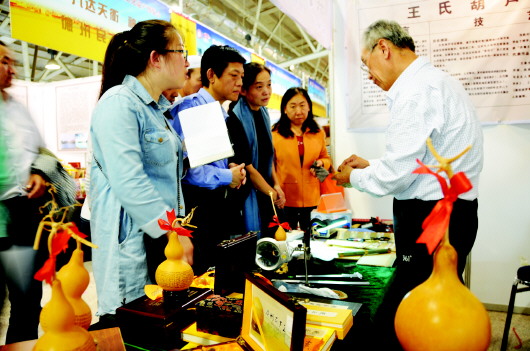 10日,第三届中国非物质文化遗产博览会在济南舜耕国际会展中心举办,滨州13种非物质文化遗产项目亮相。非博会上滨州酸浆豆腐、纸皮包子、芝麻酥糖等非遗项目受到市民的喜爱,迎来回头客。图为王氏葫芦书法微烙技艺传承人王向阳正在向市民介绍用来微烙的工具和技艺。 本报记者 郗运红 摄