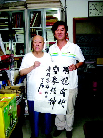 ▲欧阳中石先生为黄庆国题写“雕龙有术 塑像传神”