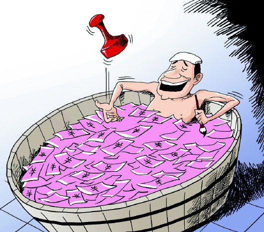 据《潇湘晨报》报道,几年来,郴州市北湖区石盖塘镇几名村干部频频出入五星级酒店和高档休闲会所,吃喝玩乐,三年来的公款花费超过150万元,仅泡脚、泡澡的支出就有4.3万元。 漫画/张建辉