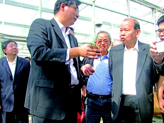 施恭旗(右一)一行参观济阳县现代农业科技示范园。 本报记者 杨擎 摄