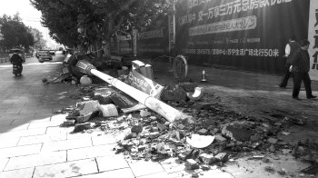 16日上午8时,记者赶到太白楼路苏宁广场工地门口,肇事车辆已被拖走,事故现场仍然一片狼藉。直径约30厘米、长约6米的路灯杆横在道路南侧,巨大的路灯顶端阻碍了部分机动车道。由于撞击剧烈,钢制的路灯底端被挤扁,高约1米的水泥底座也被撞碎,其中一块重达百斤的碎块飞出了约6米远。灯杆西侧,泄漏的汽油痕迹格外显眼,附近散落着轿车的前保险杠和一个车牌。
