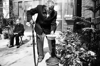 杨克泉浇花,杨房氏在一旁默默地陪着。