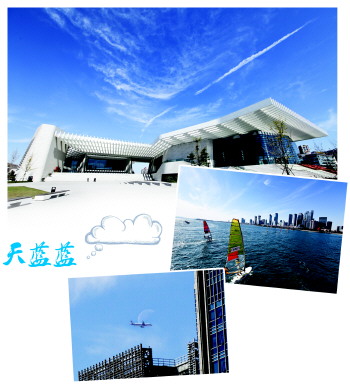 /从奥帆中心望向浮山湾,碧海、蓝天与帆船组成了一幅大美画卷。