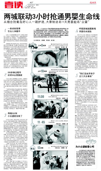 烟台11天大的男婴小众望出生后患严重肠道疾病曾经命悬一线,在微博网友、出租车司机、警察、医护人员的爱心接力下,小众望被送入青岛市妇儿医院接受治疗(本报10月15日A07版、16日A07版曾报道)。