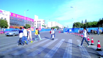 16日,滨州路部分路段已设置围挡,学生从马路穿过。本报记者 李玉涛 摄