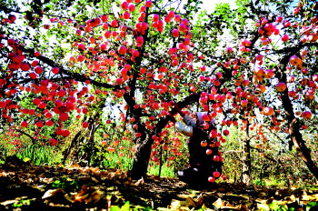 10月16日,东港区河山镇汪家官庄村,村民汪照叶正忙着采摘苹果。目前,正是早熟苹果嘎啦、国帅、红星、美国8号大量采摘上市的季节,红彤彤的果实挂满枝头,散发着诱人的香味。