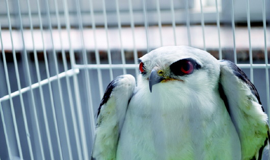 该鸟头部羽毛为白色,眼睛为红色,嘴锋利且嘴基部带钩,下嘴被上嘴覆盖,鼻孔为椭圆形,脚为黄色,爪长而尖,背部羽毛为灰褐色,经专家鉴定,该被困鸟类为黑翅鸢,属于隼形目、鹰科,系国家二级保护动物。