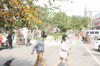 16日在青檀路,路边绿化带中的很多灌木上结出了很多黄色小果子,密密麻麻压弯了树枝。据了解,随着气温转冷很多花草树木已经开始换秋装,另外本周日枣庄或将迎来一轮降雨天气,出行市民需要注意。 本报记者 袁鹏 摄影报道