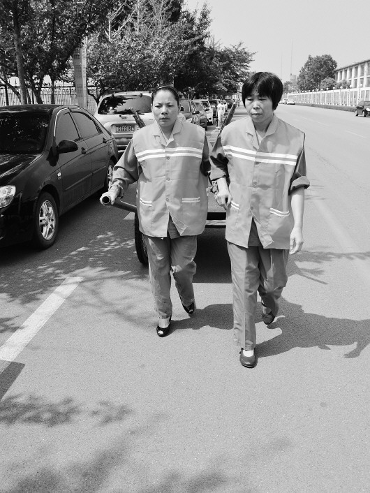 张梅(右)和牟秀萍在工作中,她们都是兖矿集团的环卫工。