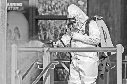 18日,在美国达拉斯的一个车站,一名身着隔离服的工作人员正在喷洒消毒药水。当日,一名女性在这个车站病倒,症状疑似感染埃博拉病毒。据报道,这名女性曾和美国本土第一例埃博拉患者邓肯住在同一栋公寓楼内。 新华/法新