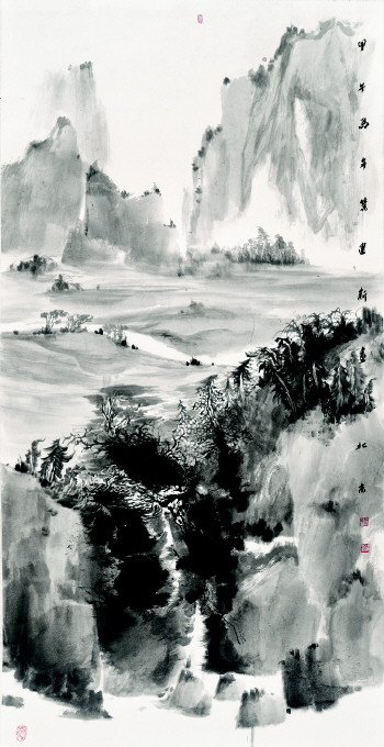 除了对山水画“神”的特质的捕捉,叶建新还非常重视山水画笔墨中的“气”。在他看来,中国山水画中的美学特征,或大气磅礴,或清气婉约,或气韵风范,无墨气就无生命,也就不是画了。在创作中,叶建新分别采用水冲、白粉合水冲、飞白等技法,造成墨色的多层次,再加上潇洒纵横的墨风,隽永灵动的用笔,云的流动,山石、树木的浓郁,呈现出一种画面淋漓之气,浑厚华滋之妙,空幻溟濛之胜,给观者一丝净化了的理想之境。在行气与笔墨关系的处理上,叶建新通过线的沉涩,墨的枯湿,点的稠稀纵横,皴的披麻斧劈,以气行笔,拖出气势,梦境般的气氛和他的笔墨气息让人憧憬、幻想,体现了东方人对自然独特的感觉与心境。