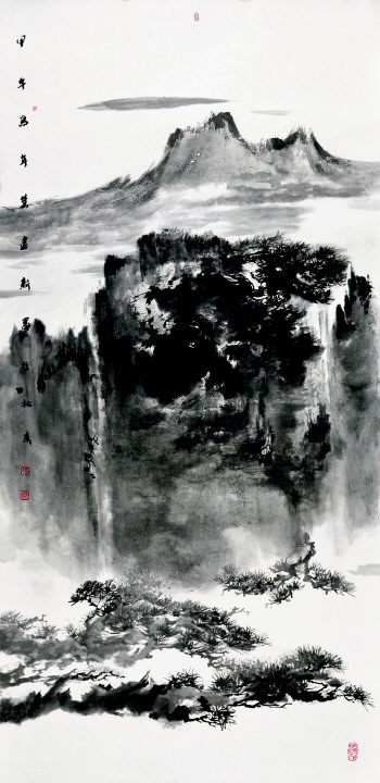 叶建新的山水画,大气磅礴,洒脱自然,其大胆的构图、大块的墨色、大笔的渲染,可谓恣肆淋漓、云覆山翻,充盈着蓬郁的生机。叶建新作山水画,深知山水画的精神价值定位,也特别领悟到“神”与“气”在山水画中的核心旨意,他主张“精气为物,游魂为变”,以“气”入画,重在写山水物象之“魂”。在这批水墨、青花新作里,我们既能体会山水画的本质,又能看出叶建新在艺术上的自我个性气质。