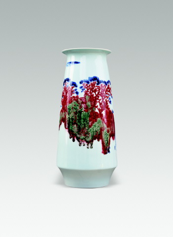 叶建新的青花瓷作品,造型大多是瓶、罐、觚还有茶具和瓷板等,瓷上的绘画多数是他喜爱的山水题材。几年来,他多次亲历名山大川,积累了大量的创作素材,追求那种“我有胸中十万竹,一时飞作淋漓墨”的境界。但是在瓷器上作画与在宣纸上作画虽然有相通之处,但二者的材质不同,呈现出的效果也与预期有相差,经过多次研究与尝试,叶建新通过用笔间歇的时间、速度以及水分的多少,达到了对釉料的掌握和控制,现在他已经能够游刃有余地掌握和控制釉料,自由地在瓷器上挥毫笔墨,完美地展现青花瓷水墨氤氲的效果。