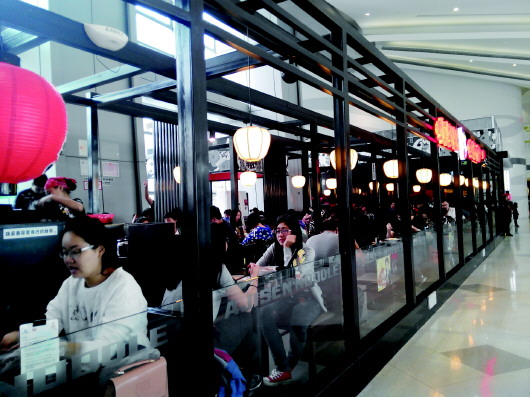 ▲城市综合体内的餐馆人气很旺,但购物专卖店人气不足。