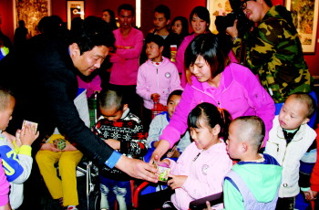 ▲山东美术馆馆长徐青峰向济南市儿童福利院的孩子们赠送艺术衍生品
