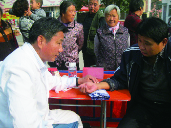 随着天气变凉,家住康城花园的于先生腿又疼了,他再次来到活动现场请郝大夫治疗,郝大夫已免费为他推拿、按摩多次。这次郝大夫为他拔罐、针灸,并告诉他注意事项。