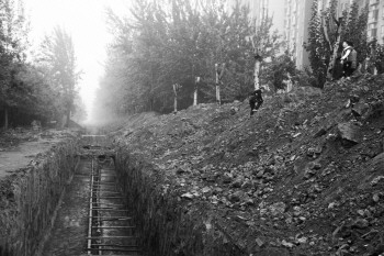 10月19日,在七里庄附近有管道维修,施工人员挖出了一条深约三米左右的沟渠,里面有很多支架。恰逢周末,几个孩子在旁边的土堆上跳跃着玩耍,很是危险。 本报记者 王小会 摄