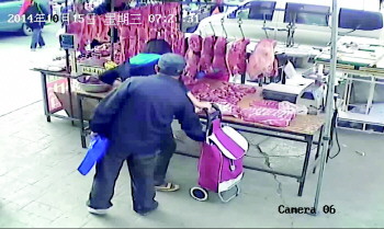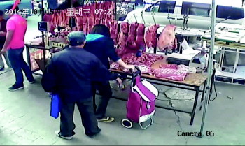 监控显示,就在吴女士在肉摊前面专心挑选猪肉时,一名头戴棒球帽,身穿深蓝色夹克的男子一直尾随在吴女士身后,并且多次四下观望,在吴女士放松警惕的一瞬间,中年男子迅速从身后贴近,用手指将吴女士的钱包从购物车内夹了出来,随后男子转身逃走,而吴女士丝毫没有察觉已经失窃。