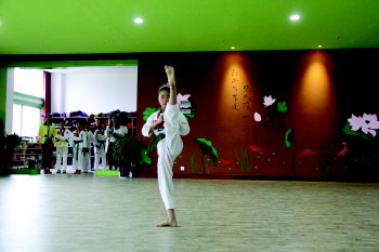 19日上午,2014山东省少儿跆拳道大赛泰安赛区的比赛拉开帷幕。全省17个地市共有1800多名选手报名参赛。图为小选手在做展示动作。 本报见习记者 邓金易 摄