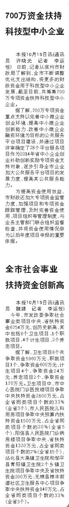 本报10月19日讯(通讯员 许晓光 记者 李运恒) 日前,记者从滨州市财政局了解到,全市不断调整优化支出结构,将更多的财政资金用于科技型中小企业发展,截至目前,共筹集700万专项资金扶持科技型中小企业。