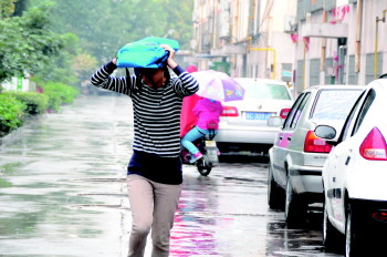 19日,桓台县下起阵雨,一名学生拿书包挡雨。 本报记者 姜文洁 摄