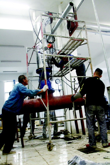 10月20日,德州学院东区宿舍楼院内,施工人员在新增的供热站内拆装供暖管道。 本报记者 王小会 摄