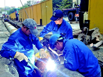 20日,在大世界步行街,威海市热电集团有限公司工作人员紧张地铺设蒸汽管道。工程预期进行12天,热电集团工作人员说,他们将尽量抢在供暖季节来临前完工。