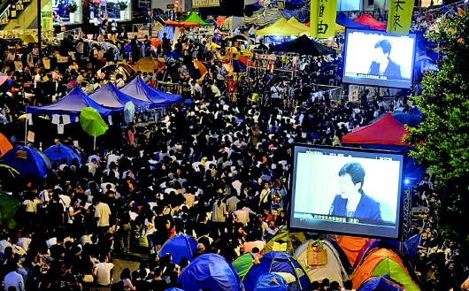 ◥10月21日晚6点,香港特区政府与学联对话在黄竹坑医专学院举行,金钟非法集会区设置电视直播,集会者在此观看。 中新社发