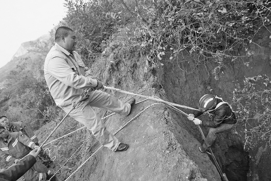 救援人员下井救人。 本报记者 赵金阳 摄