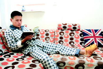 ◥在家休养的翟斌锋看书打发时间。  本报记者 苏洪印 摄