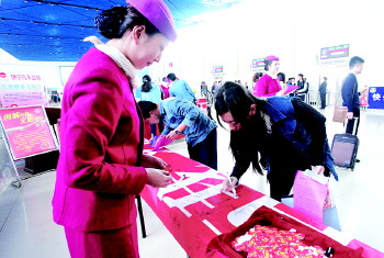乘客徐先生在条幅上写下了自己的名字,工作人员在他的胸前为他佩戴上“文明接力”的心形牌。“我常年在外出差,奔走于各个车站,车站是最展现一个城市形象的窗口,而每个乘客都是城市形象的维护者,应该用实际行动去拒绝不文明。”徐先生说,不随手扔垃圾,不随地吐痰,不在公共场所吸烟、大声喧哗这些都是在公共场合必须做到的,但又是最容易忽略的。