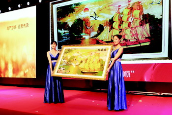 20日晚,在香格里拉大酒店,工作人员展示由梦圆特教学校老师花费了8个晚上用水钻粘的钻石贴画《一帆风顺》。当晚,来自岛城各界的300位爱心人士及爱基金会员参加了慈善总会爱基金7周年爱心拍卖活动。拍卖会拍出20件拍品,共筹集善款311.68万元,所筹善款将全部用于资助贫困学生。