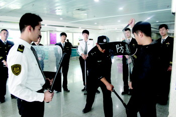 安检升级,防暴演练同时进行。21日上午,一名蒙面“歹徒”冲进了青岛长途汽车站的二楼售票厅。“橡皮棒不要直接打头,要击打肘部或者腿部关节!”“射网枪要保证10米左右的距离才能发挥最大功效。”民警现场指挥说。车站员工扮演歹徒,闯入售票厅想要攻击购票旅客,民警与车站的防暴人员通过擒拿术和防暴工具最终将其制服。