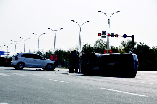 21日下午2时许,在黄河十二路渤海十八路路口,一辆自东向西行驶的白色轿车与一辆自西向北左转弯行驶的面包车发生相撞,造成轿车前部受损,面包车发生侧翻,所幸没有人员伤亡。据目击者称,两辆车很可能是过路口“抢黄灯”造成的。