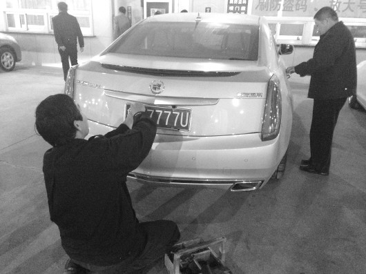 22日,一位车主选到了“7777”四连号的车牌。图为车管所工作人员在为车辆挂牌。 本报记者 张焜 摄