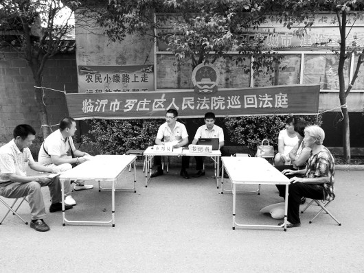 临沂市罗庄区人民法院付庄法庭的法官到当事人家门口的小巷巡回办案,村民旁听为其点赞。(资料片)