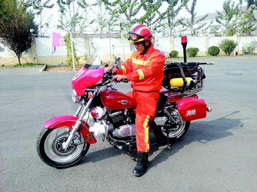 ▲单兵消防摩托车专门用于狭小街巷的灭火救援。