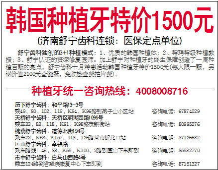 舒宁齿科独创的3+1种植模式:1、优质的韩国种植体;2、特聘特级种植教授;3、舒宁认证的资深修复医师。加上舒宁对种植牙的终生保障创造了一周种植百颗的亮点。舒宁齿科十月特惠活动韩国种植牙特价1500元(每人限一颗,另送价值2100元全瓷冠,免收检查费拍片费)。