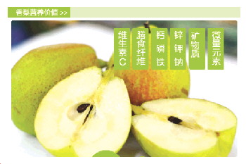 秋高气爽之时,空气里的水分较少,人们容易出现咽干鼻燥,唇干口渴、皮肤干涩等典型的“秋燥”现象。中医专家称,秋季是伤肺季节,首要任务就是养肺,别让呼吸类疾病缠身。而库尔勒香梨对秋燥症有其独特的疗效。据了解,库尔勒香梨比其他同类梨肉质更细、皮更薄、含糖量高且酥脆爽口;耐贮藏,有清心、润肺、降火、生津、滋肾、补阴功效。不妨每天早晚吃一个梨,有条件者,每隔一两天,将梨和冰糖、川贝、蜂蜜等煮着食,效果更佳。