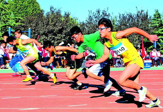 近日,高新区各学校纷纷举行2014年学校秋季运动会,通过体育竞技锻炼身体素质,培养学生的参与意识和集体荣誉感,并在竞技中分享运动快乐。图为济南高新区实验中学秋季运动会上,同学们在短跑项目上竞争激烈的场面。 本报通讯员 王广辉 摄