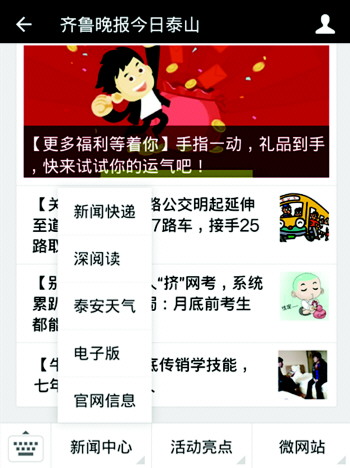 “添加本报微信对自己有什么福利?”这是很多关心本报发展的朋友的共同疑问。齐鲁晚报今日泰山微信平台致力于实现新闻快速推送、生活服务面面俱到,在给粉丝带来优质服务的同时,通过微信互动活动,保证粉丝“月月有惊喜”。