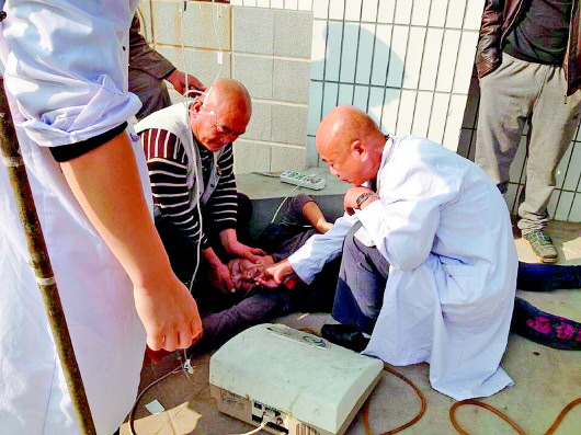 24日下午2点10分左右,被针扎女婴子萱的舅妈刘洪云在聊城高唐的家中服药自杀,图为赶来的医生为其洗胃抢救。 本报记者 王尚磊 摄