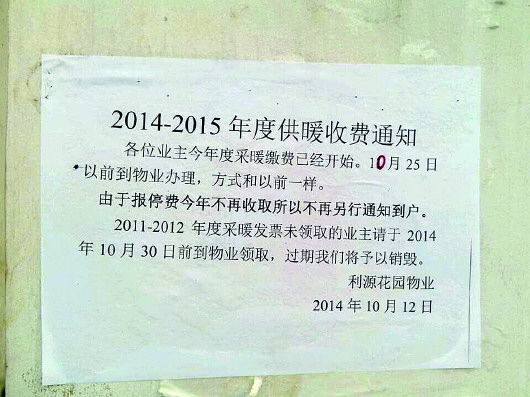 24日下午,记者在居民楼的单元门上看到,物业公司12日张贴的收费通知写着,10月25日前业主到物业缴费,缴费方式则“和以前一样”,并未写明需先缴物业费。一旁则是14日张贴的物业缴费通知,写着2014年10月14日起收本年度10月至2015年4月为期半年的物业费。前期有欠费的自觉结清。业主张先生说,以前一直都是先交物业费才能拿到自己的暖气费缴费条,虽然没有写明,但实际就是如此操作。业主张先生说,自己前些天到物业办公室准备缴今年的供暖费,但物业要求他先把物业费交上,才能把写着他的户名和缴费信息的供暖费单子给他。