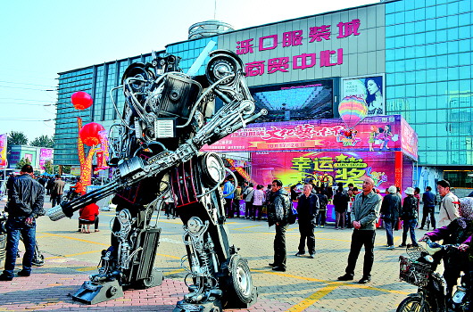 本报10月24日讯(记者 蒋龙龙) 在泺口服装城广场上,3个由废旧汽车、三轮车等零部件做成的“变形金刚”成了焦点,为泺口服装节增色不少。泺口服装节还剩最后两天,到本周日结束,市民想抽大奖买衣服的抓紧了。