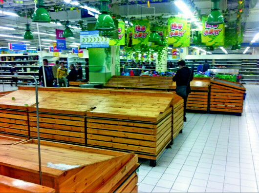 在乐购超市潍坊店,许多柜台已经空空如也,不少市民争买打折商品。 本报记者 庄文石 摄
