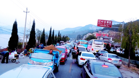 25日早上9时,由327省道拐入红叶谷的路口已经水泄不通。从东西两个方向准备进入上山路的车辆不得不停了下来。加上许多大客车在此处下客,该路口显得混乱不堪。“停车场满了!把车停我们家,坐我们的班车上去吧。”一些农家乐、黑出租的拉客人员不断地通过车窗向私家车主推销生意。
